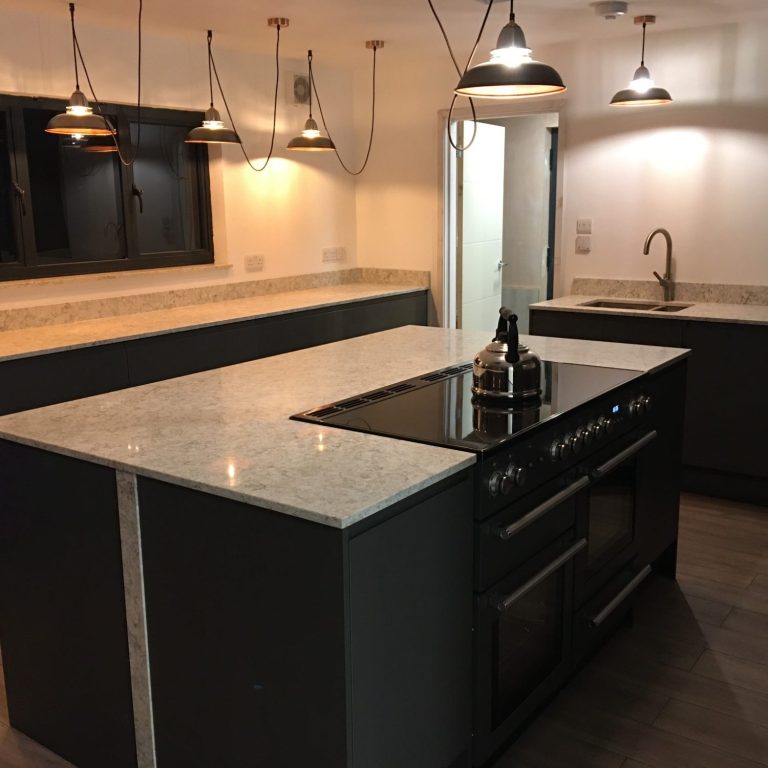 Following the building of an extension, this kitchen was designed by Riverleaf and features a Howdens kitchen, composite marble worktops sourced from a local supplier, a walk in pantry and Rangemaster and John Lewis appliances. We can fit any make of kitchen that has been designed for your space.