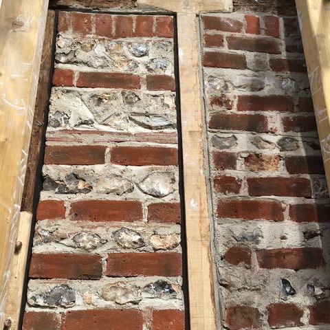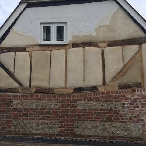 Following the collapse of the side of this 15th century cottage, Riverleaf, with strict adherence and supervision from the Conservation Office reconstructed this wall with permitted and original salvaged materials. It was necessary to preserve as much of the existing oak-frame as possible. Using fresh oak, Baz used traditional techniques to splice into the existing frame and applied lime mortar to the design required of the period.